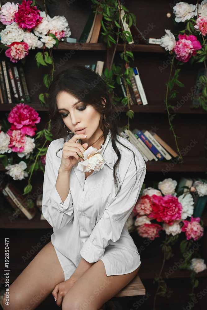 Beautiful and sexy young brunette model woman with big lips and closed eyes, only in shirt posing half-naked in library