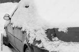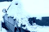 The blue car is covered with snow after snowfall.