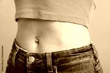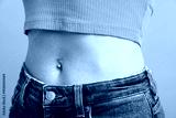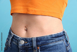 Woman with belly button piercing on light blue background, closeup