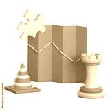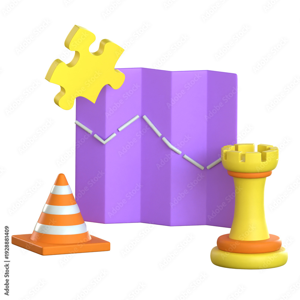 3D representation of a map with a path, a puzzle piece, a traffic cone, and a chess piece symbolizing complex route and logistics planning