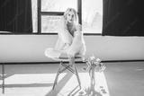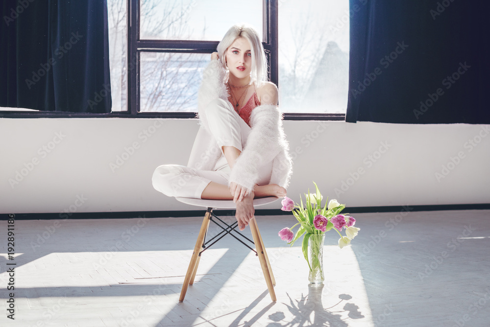 Indoor full body portrait of young beautiful girl posing in wide room, with spring sunny day light from big window. Model wearing stylish clothes.