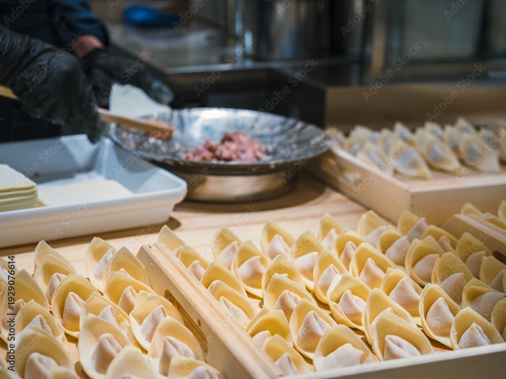 Chinese street food People preparing Wontons Dumpling Stuffed Pork and shrimp China travel