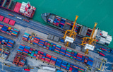Container ship in import export and business logistic, By crane, Trade Port, Shipping cargo to harbor, Aerial view from drone, International transportation, Business logistics concept