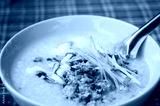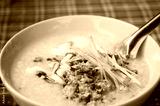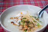 Rice porridge pork minced egg in bowl with tartan pattern background
