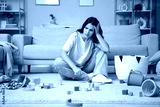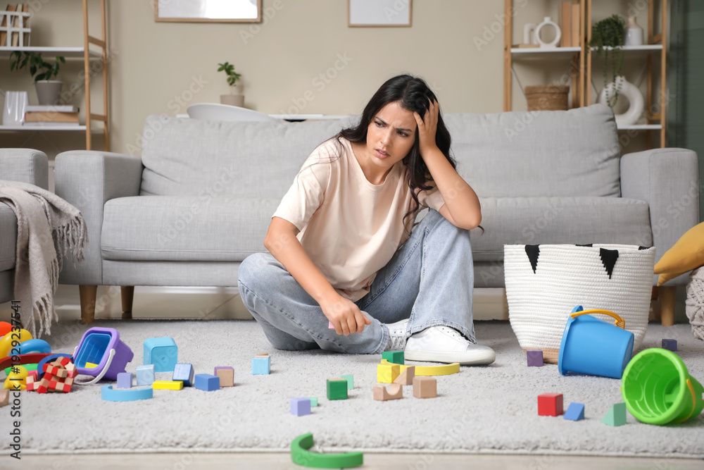 Tired young mother resting among scattered children's toys at home. Stress concept
