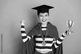 Young student graduate celebrating victory wearing graduation cap red cape striped sweater medal and holding trophy against blue background