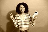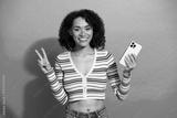 Young chic multiethnic woman smiling holding smartphone and posing for lifestyle photo