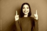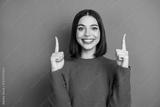 Happy young woman in a green sweater points up with both fingers against an orange background for a bold and stylish promotional image