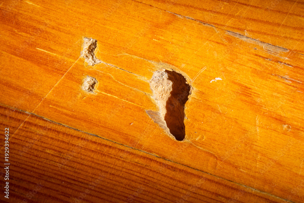 Termite Damage Hole in Wooden Floor Close Up Pest Infestation Concept