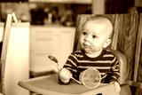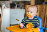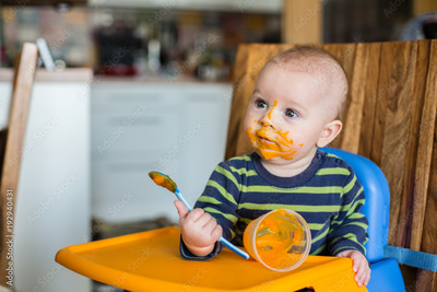 Little baby boy, eating mashed food for the first time
