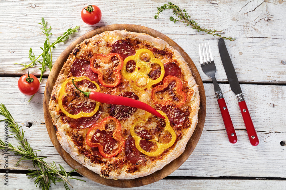 Delicious pizza served on wooden plate