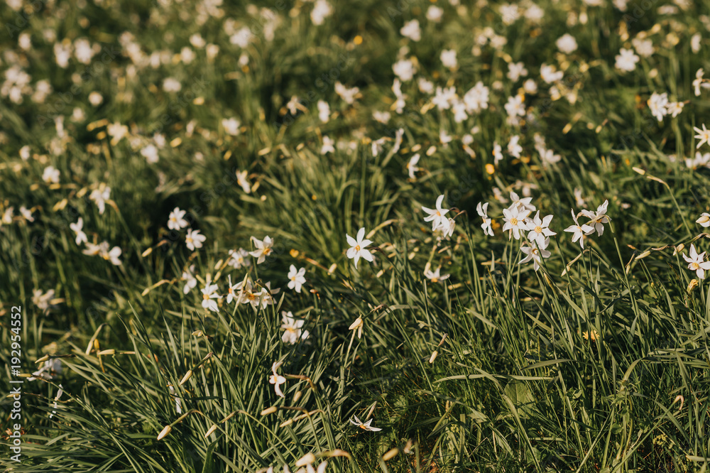 Spring field with growing wild daffodils