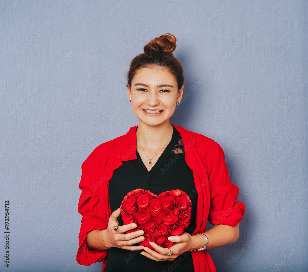 Portrait of young girl with red hair taken on violet background, holding big heart