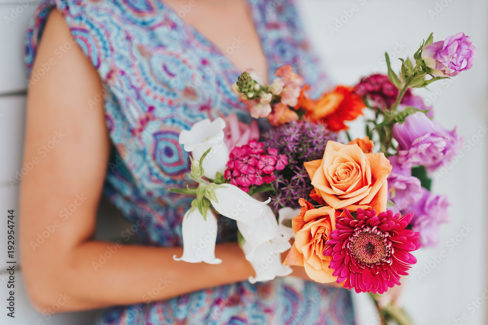 Simple and beautiful bouquet of mixed flowers holding by a young girl