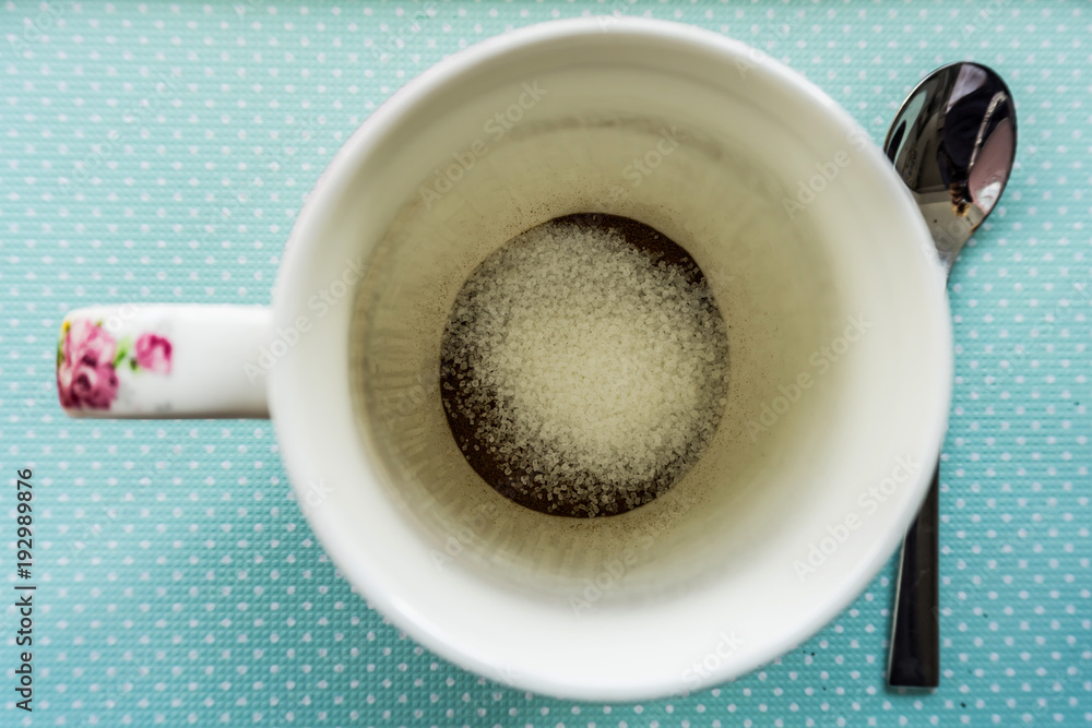 Closup a cup of fragrant, fresh instant coffee with a spoon and a tray. Shollow depth of field. Concept morning freshness.