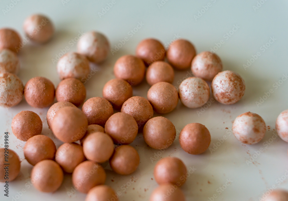Close-up of brush and face makeup pearls in gentle pink shades on a white background. Shallow depth of focus. Concept of beauty fashion.