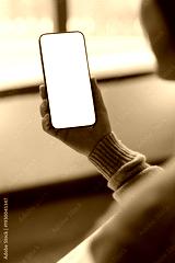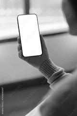 Vertical mockup image of a woman holding and using mobile phone with blank desktop screen at home
