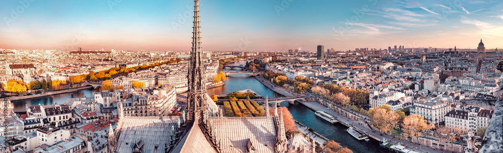 High resolution aerial panorama of Paris, France. The river Seine and autumn colors with blue sky.