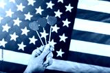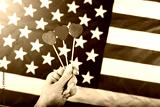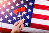 Woman hand holding three red hearts shape on stick in front of american flag. Visual concept of preparation for Independence Day. Fourth of July patriotic consept.