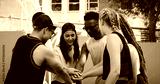 Group, huddle or people with motivation on basketball court for collaboration, tactics or support. Training game, teamwork or outdoor athletes for solidarity, fitness or workout in sports match