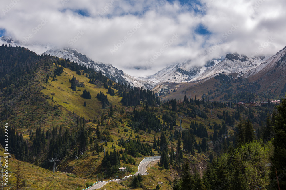 Picturesque car road and mountains covered with snow, Chimbulak, Almaty, Kazakhstan