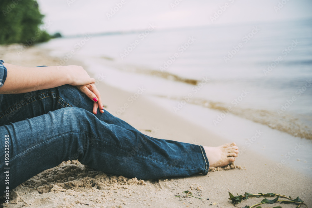 Girl is sitting on the seaside in jeans