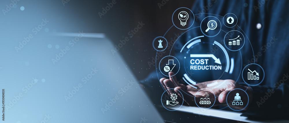 Cost reduction digital interface over hands with business icons on blue background, surrounded by finance symbols and analytics elements in modern tech style.