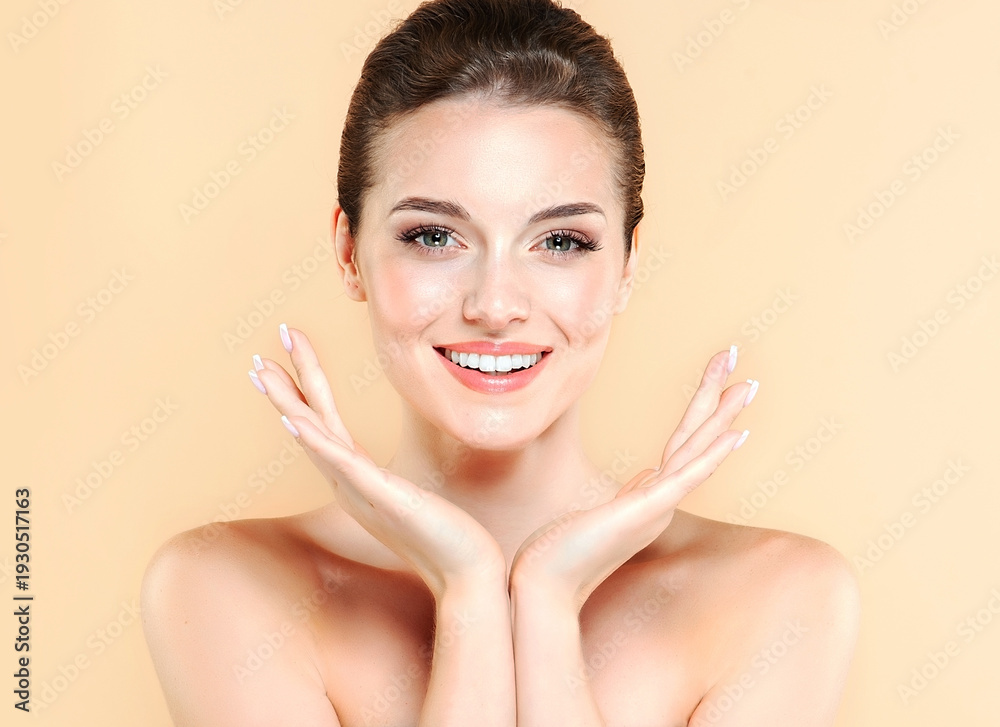 Beautiful young smilling woman with clean fresh skin .She gently touches her face with her hands. Girl beauty face care. Facial treatment . Cosmetology and Spa