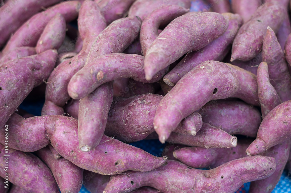 Close-up Sweet Potato purple peel yam raw many in market background