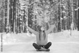 Young smiling woman in a bright clothes sits on a road and hands up in a winter forest