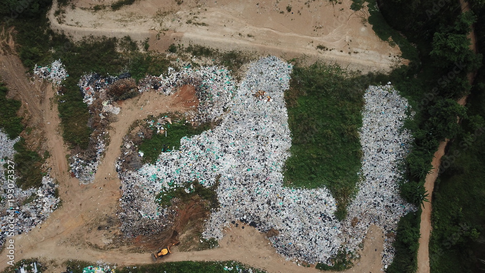 Plastic pollution - landfill garbage dump. Plastic bags and bottles pollute the environment