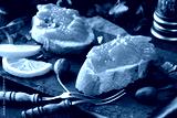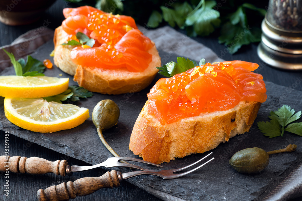 Smoked salmon slices with salted salmon caviar decorated with fresh parsley leaves