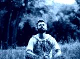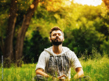 A bearded man meditating in the park