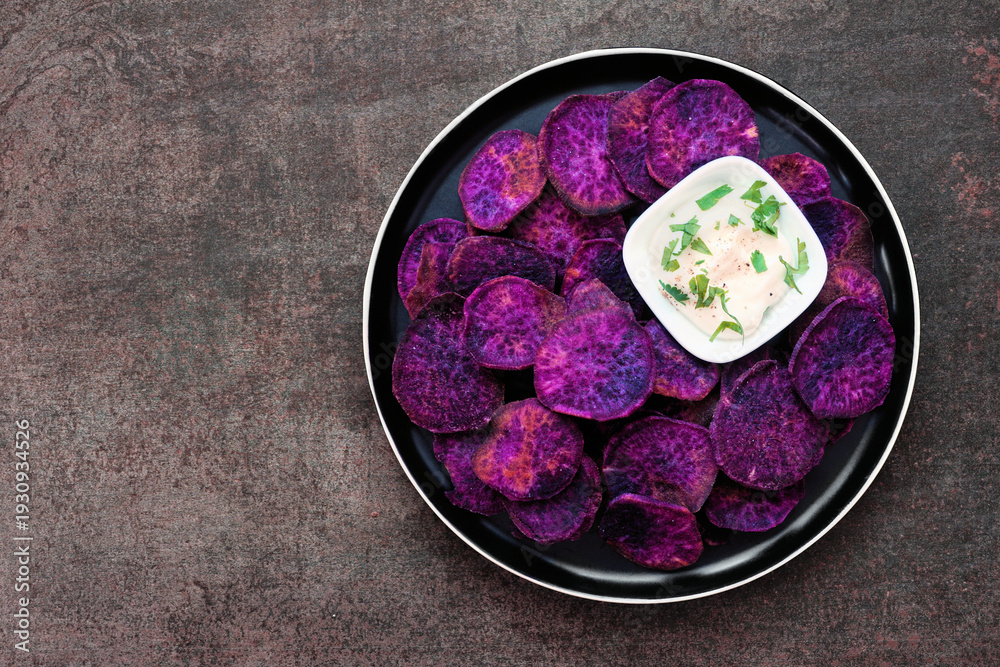 Plate of homemade purple sweet potato chips. Nutritious healthy snack. Overhead view on a dark stone background.