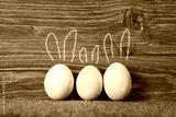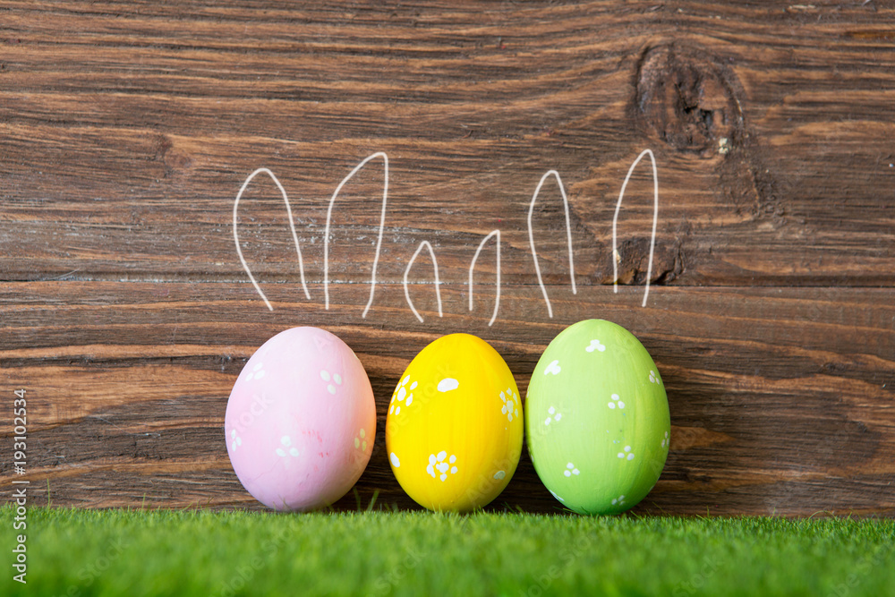 Colorful Easter eggs on grass with painted rabbit ears on wooden background