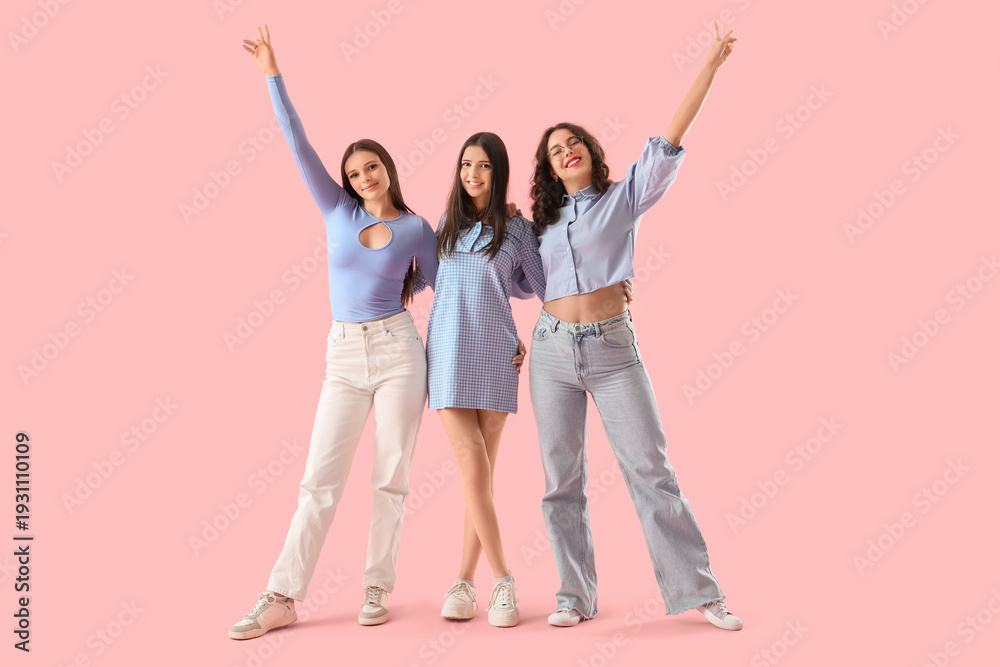 Happy teenage girls on pink background