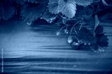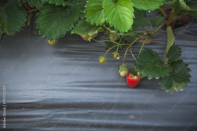 Close up Strawberry growing in farm garden with dew cold weather white space background
