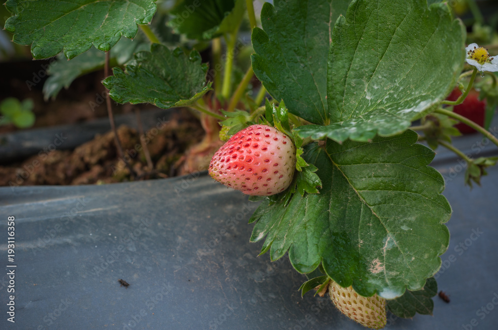 Close up Strawberry growing in farm garden with dew cold weather white space background