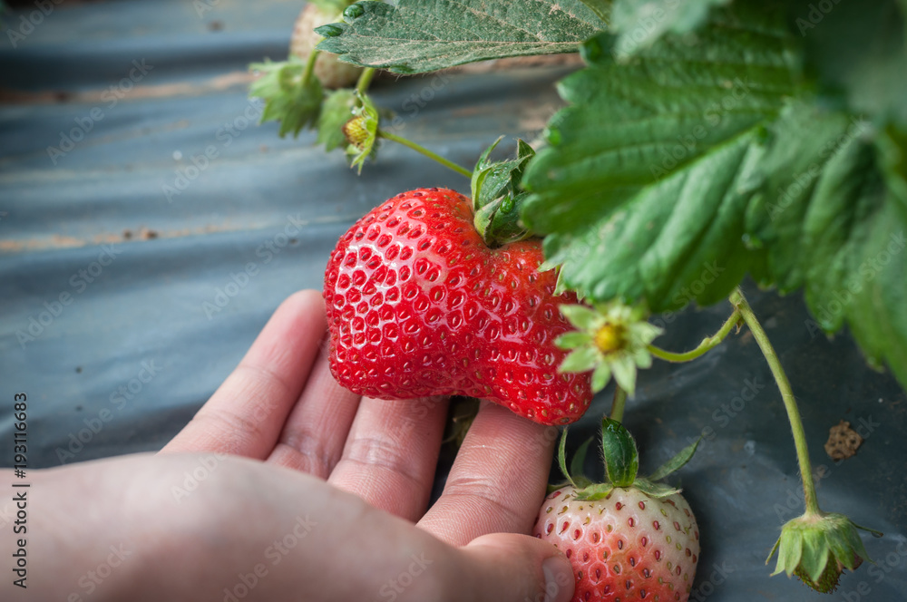 Girl hand hold ripe strawberry in garden, cold weather fruit