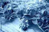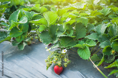 Close up Strawberry growing in farm garden with dew cold weather white space background