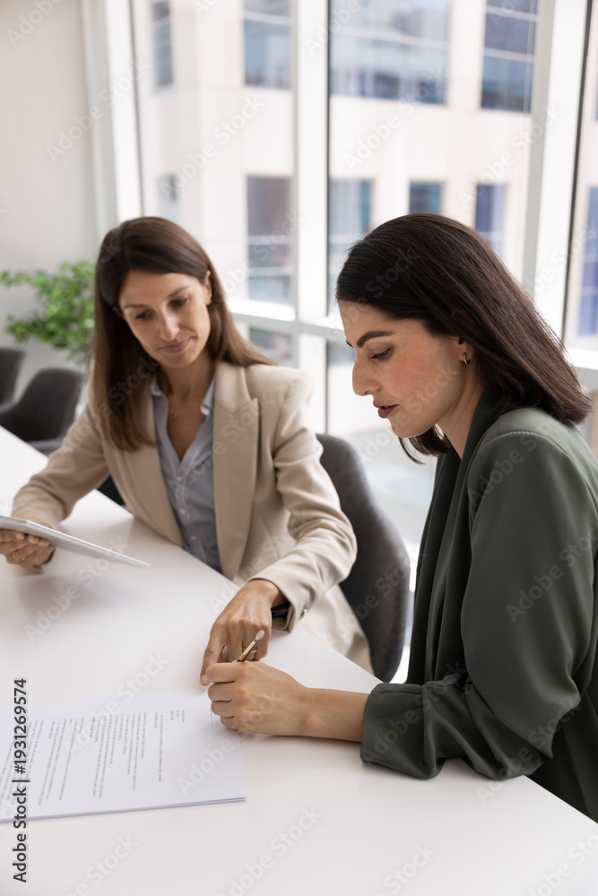 Focused Mexican woman sits at conference table holds ballpoint and signing contract paper during formal meeting with middle-aged 40s manager. Client services, formal agreement conclusion, deal closing