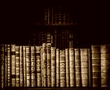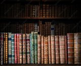 Old book on a bookshelf background. Selective focus. Science and education design concept.