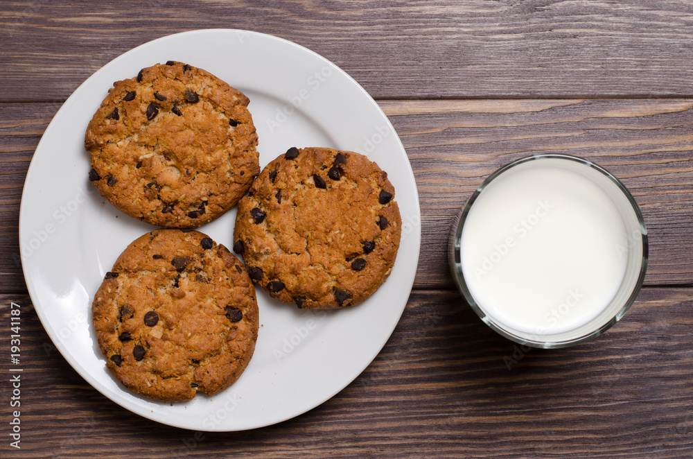 Homemade oatmeal cookies on a white plateand milk. Wooden background