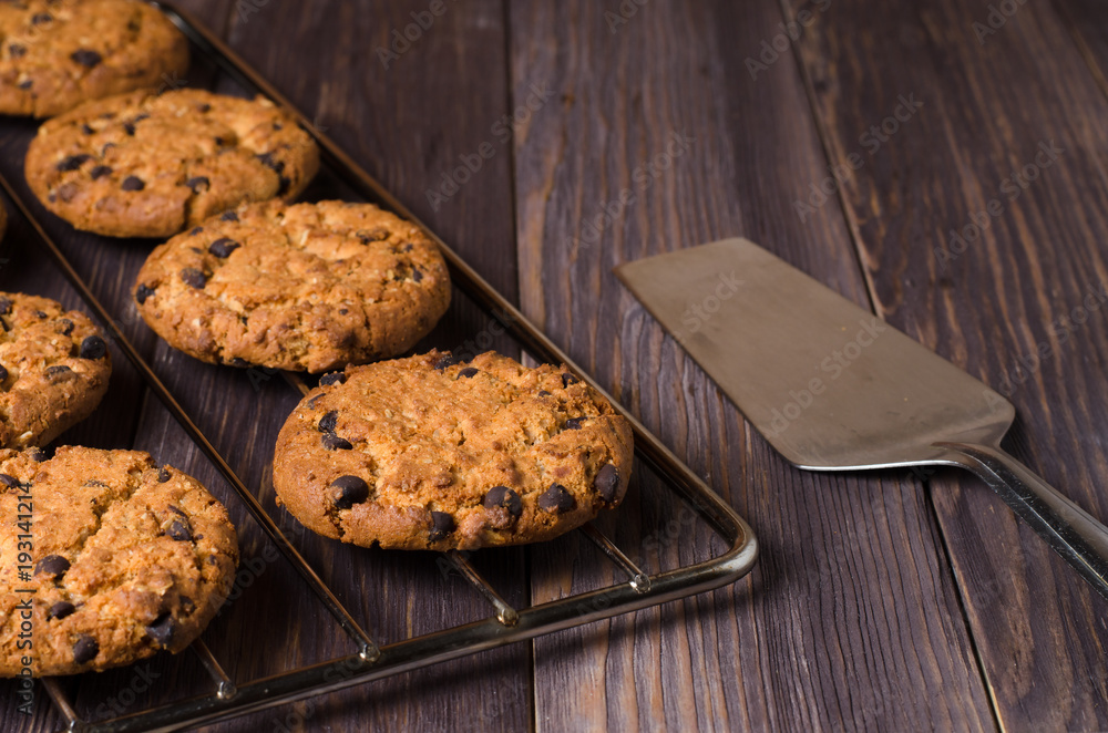 Homemade oatmeal cookies on cooling rack. Wooden background