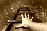 Development Motivation Career Growth Concept. Mans Hand Reaching For Red Ladder Leading To A Blue Sky