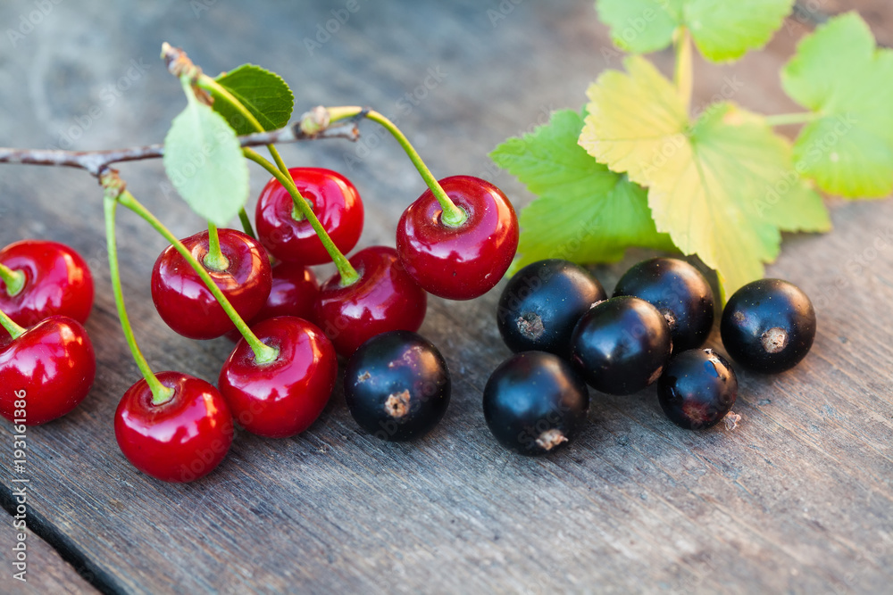 Blackcurrant red cherry berries macro view. shallow depth field photo.
