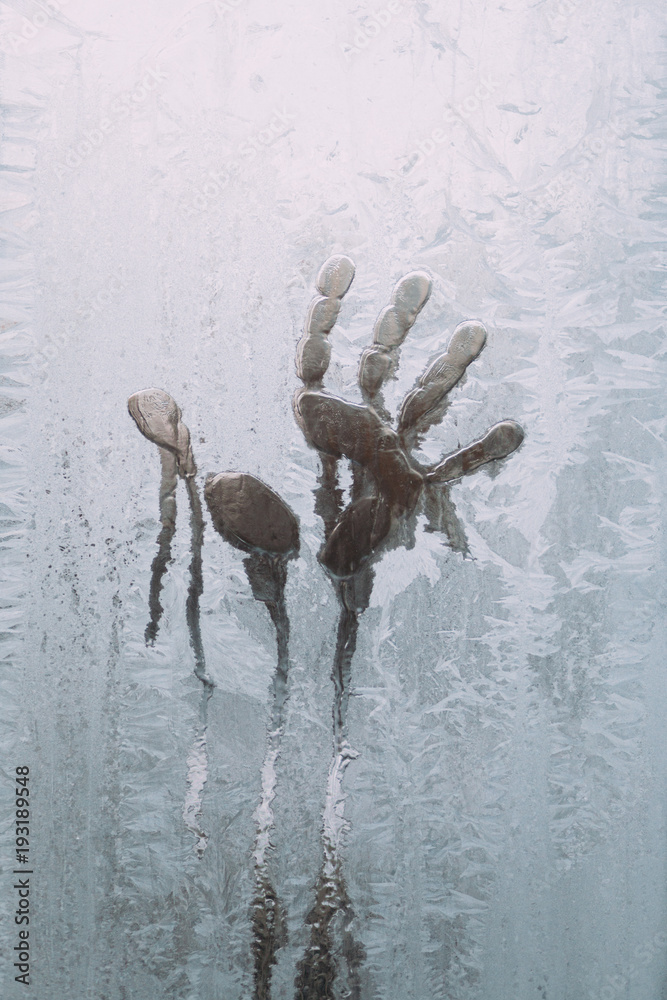Man's hand imprint on frozen window