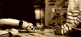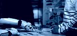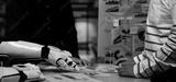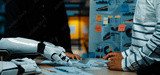 A human and a robotic arm engage in a collaborative discussion in a modern office, analyzing data charts and visuals to enhance productivity and innovation.Noogenesis