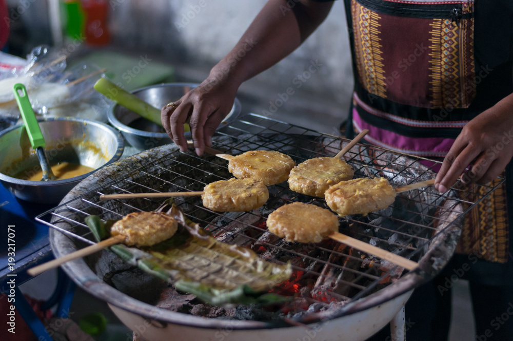 Sticky rice grilled on stove, tasty snack north-east thai cold weather
