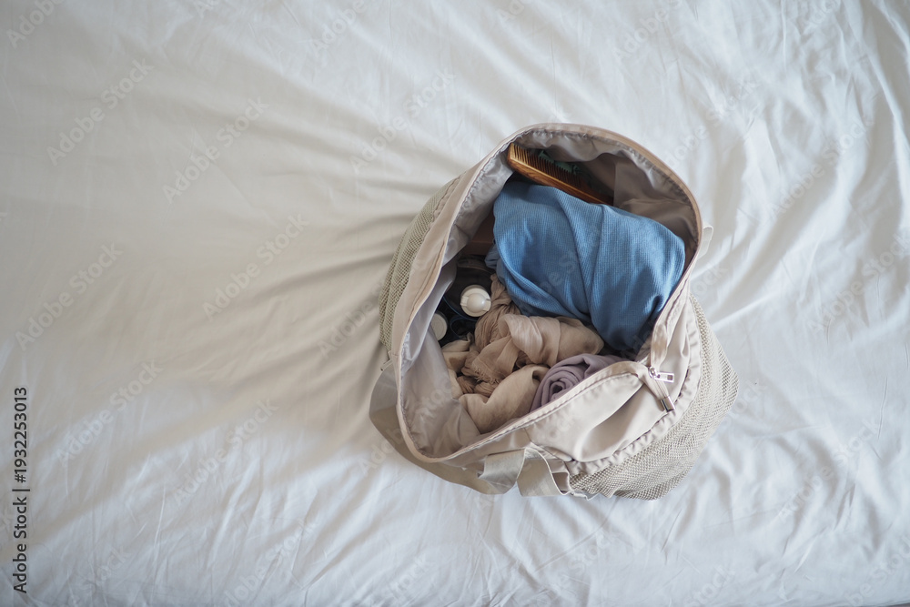 Bag with clothes and items on bed in a room